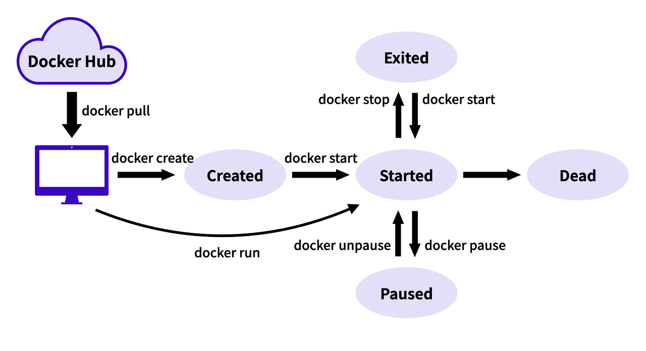 도커 컨테이너의 독립적인 특징을 기반으로 한 Lifecycle이 있다. 위 그림을 살펴보면, 컨테이너의 생성, 실행, 종료의 과정을 이해할 수 있다.