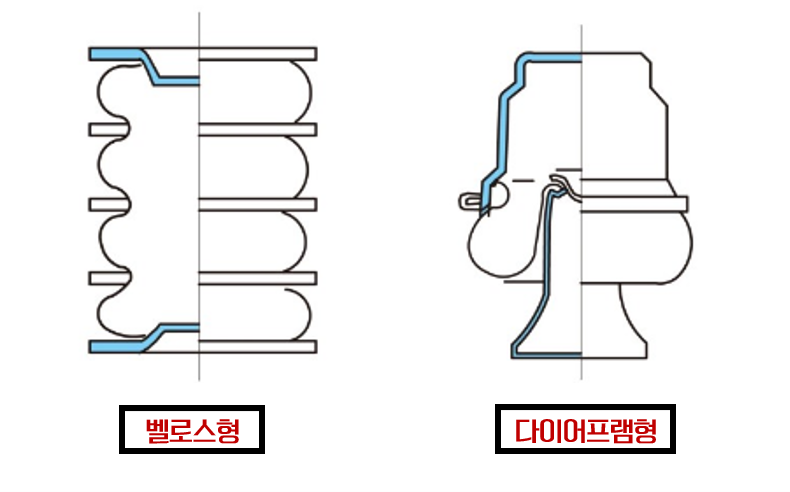 에어서스펜션 내 스프링의 종류로는 벨로스형, 다어프램형 등이 있는데, 벨로스형은 오로지 상하방향의 충격을 흡수하도록 개발되었고, 횡방향에 대한 강성이 매우 낮았다. 다이어프램형은 횡방향에 대해서도 복원력을 갖고 있어서 상하좌우 어느 방향의 충격도 흡수할 수 있게 되었다.