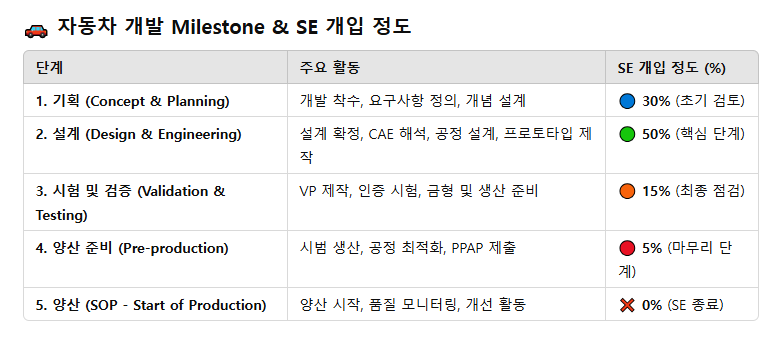 자동차 개발 주요 Milestone에 따른 SE 수행 정도