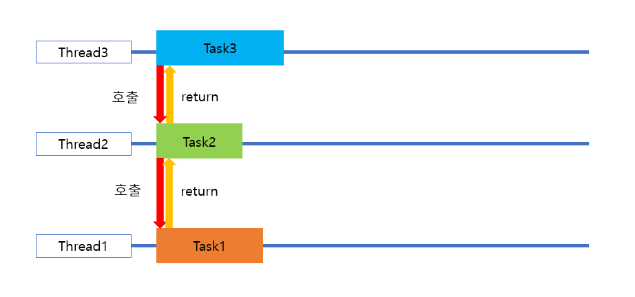 - Thread1에서 작업이 시작되고, Task1이 끝날때까지 대기했다가 완료가 됨과 동시에 Task2가 시작된다.
