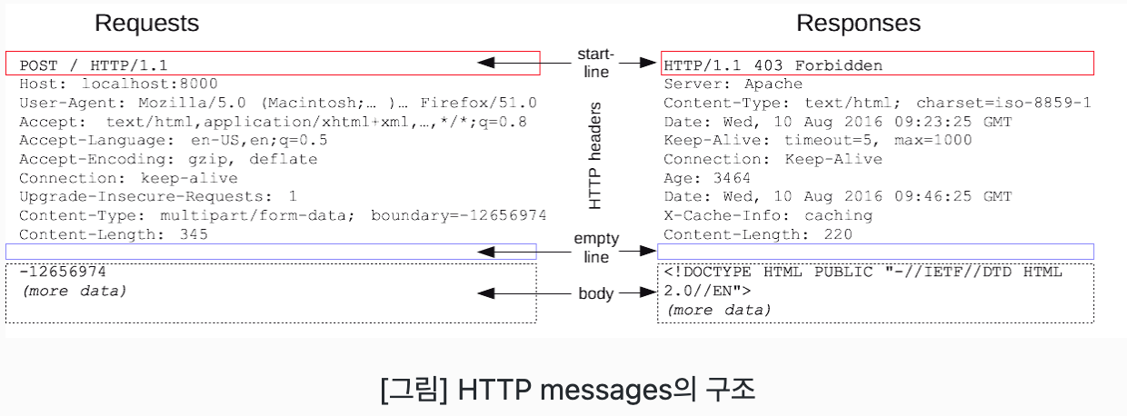 이 중 start line과 HTTP headers를 묶어 요청이나 응답의 헤드(head)라고 하고, payload는 body라고 한다.