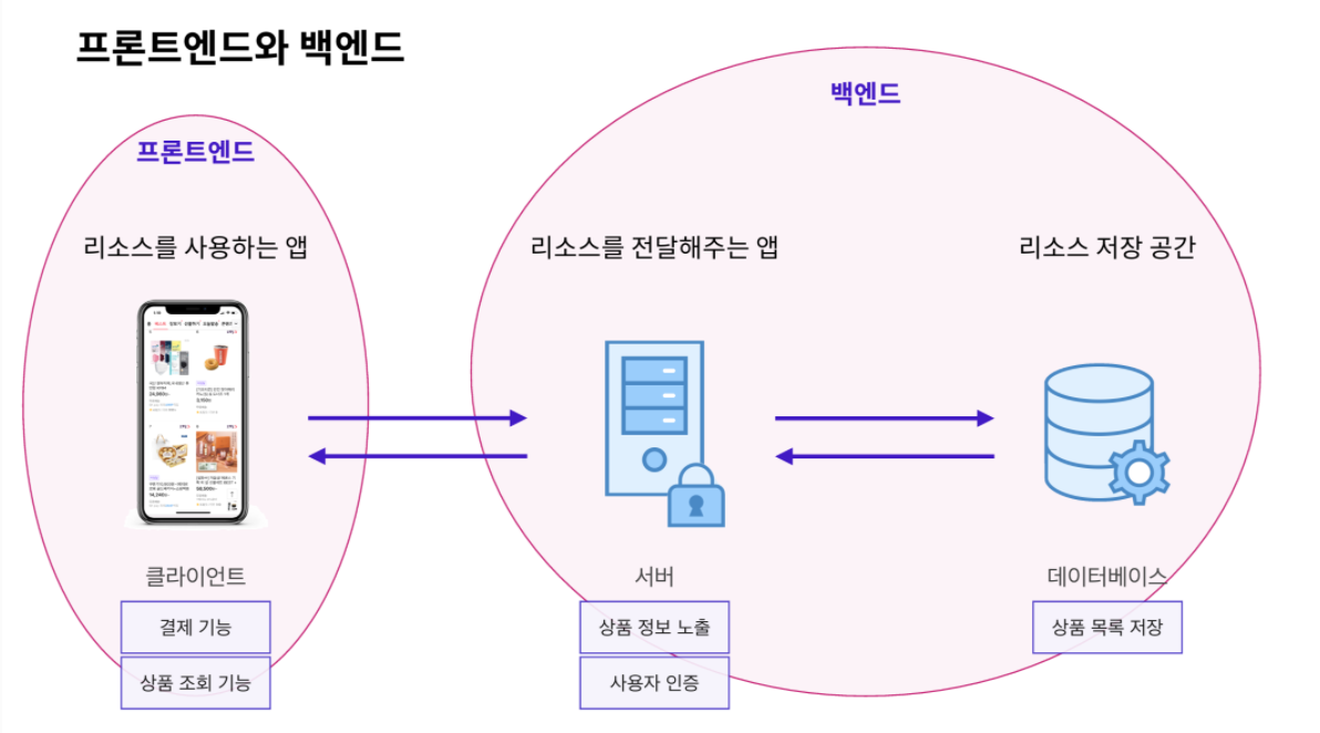 클라이언트처럼 사용자가 직접 눈으로 보고, UI를 클릭 또는 터치하는 등의 상호작용을 할 수 있는 앱을 주로 개발하면 프론트엔드 개발자라고 할 수 있다. 반면, 사용자 눈에 보이지 않지만, 상품 정보를 API로 노출한다던지, 로그인/로그아웃, 권한 관리 등의 사용자 인증을 주로 다루는 개발자는 백엔드 개발자로 분류할 수 있다. (서버가 단순히 전달만 하는게 아니다!) 백엔드 개발자는 데이터베이스 등의 시스템 설계까지 도맡아서 하는 경우도 많다.