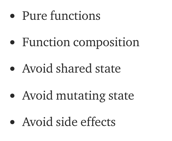 함수형 프로그래밍의 룰 중 중요한 점은 우리가 어떤 기능을 만들 때, pure function으로 작성하는 것을 우선적으로 하여 외부와 상태를 공유하거나 data를 변경하면 안된다는 것, 즉 절대로 외부의 상태에 영향을 주면 안된다는 것이다. 만일 우리가 의도했든 의도하지 않았든, 함수가 외부의 상태에 변화를 주게되었다면 side effects로 간주하게 되며 함수형 프로그래밍의 가장 원론적인 존재 이유를 망가뜨리게 된다.