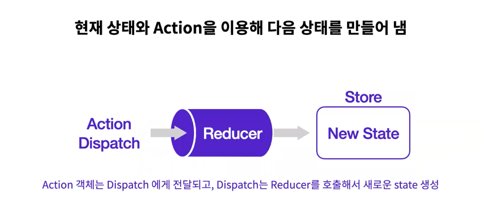 Action 객체가 Dispatch 메소드에 전달이 되고, Dispatch는 Reducer를 호출해서 새로운 State를 생성한다.