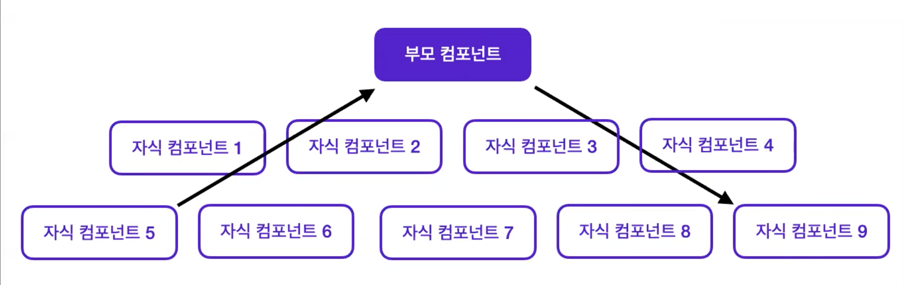 예를 들어 자식 컴포넌트 5번에서 9번으로 전달하려면, 그 과정 자체가 매우 복잡해지는 상황이 벌어지는 것이다.